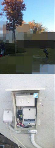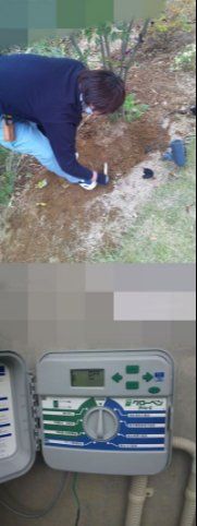 ③後日追加、散水タイマーの設定。元々あったスポット3台に、新しいタイマー回路にして欲しいとのご依頼。地中埋設オール配管施工、配線切替、動作確認。他社で施工された散水機の雨量センサーの接続調整